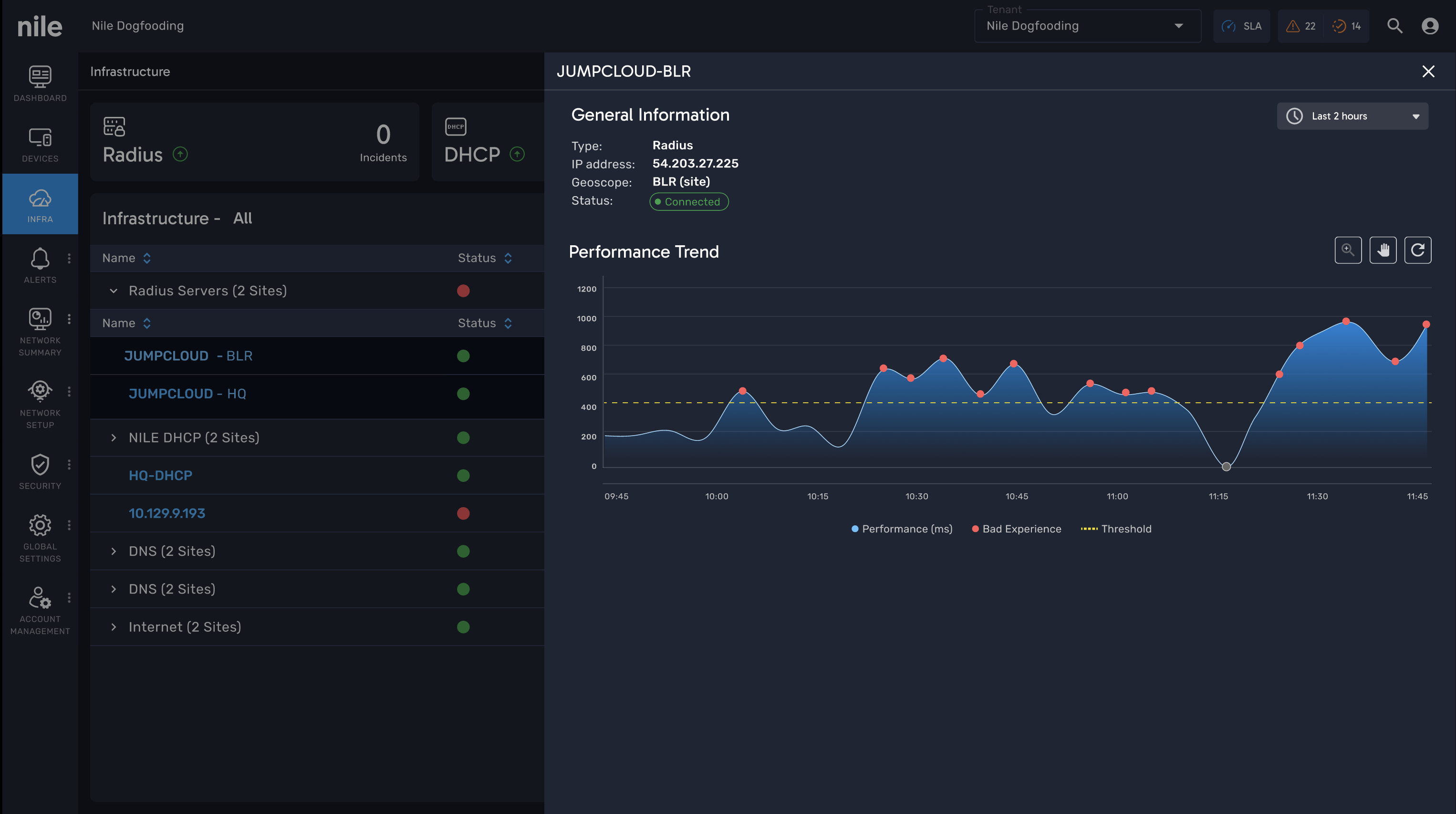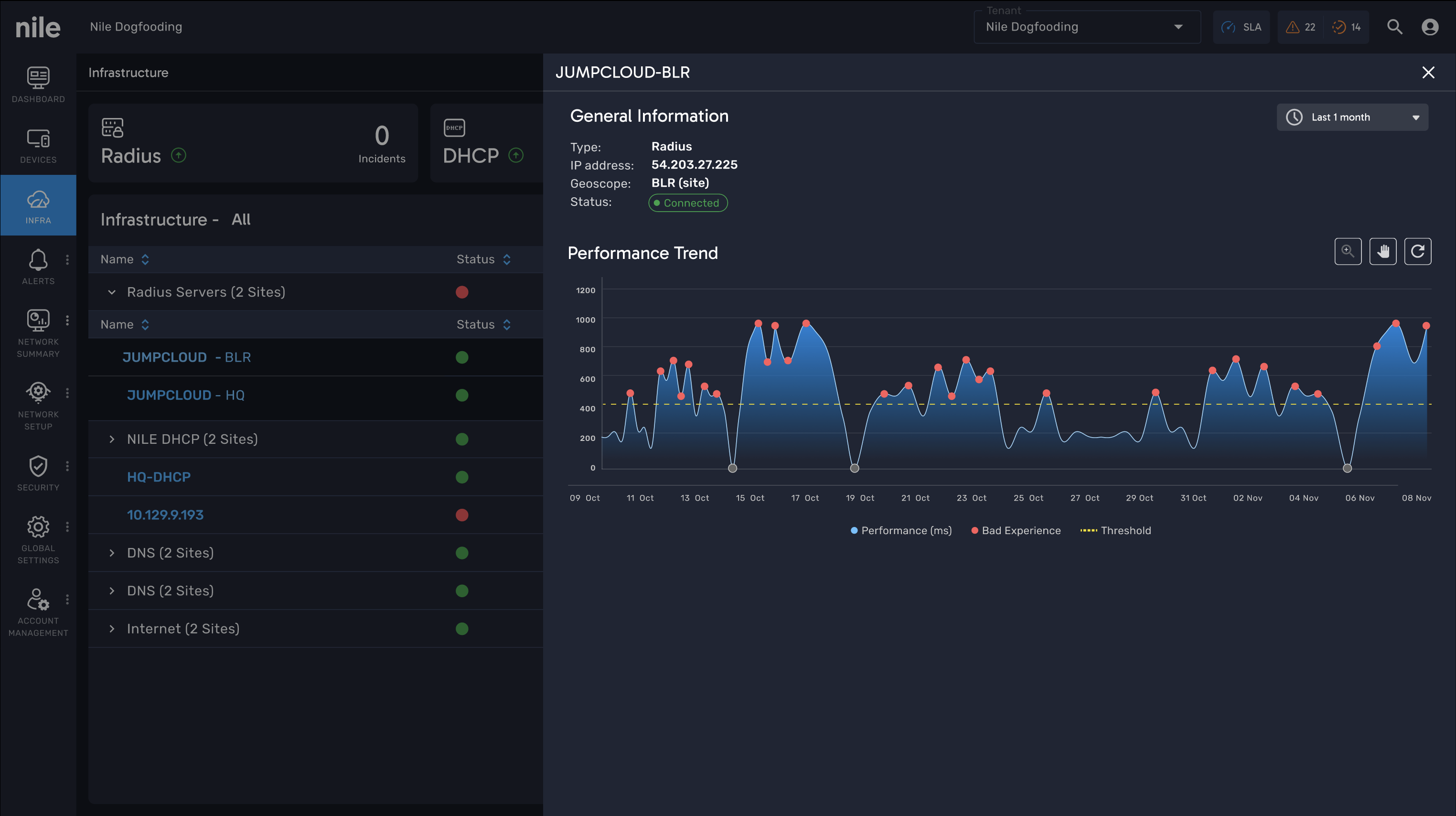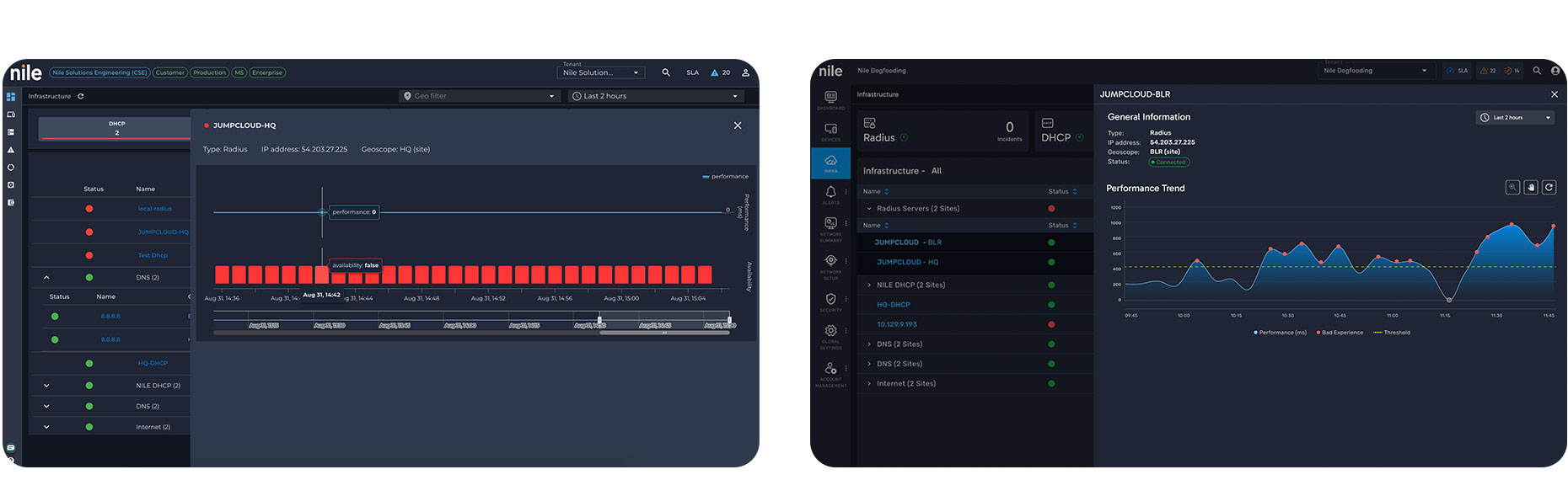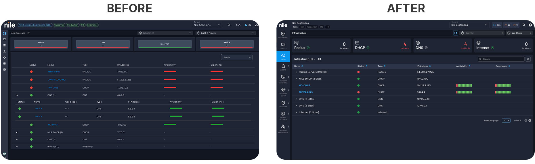 The Infrastructure page is the backbone of Nile Cleo, where admins and CSEs monitor RADIUS, DHCP, DNS, and Internet services across sites. The original design provided basic visibility but suffered from usability issues, inconsistent design patterns, and accessibility gaps. The redesign aimed to deliver a clear, consistent, and scalable monitoring experience, while aligning the product with Nile’s evolving design system.