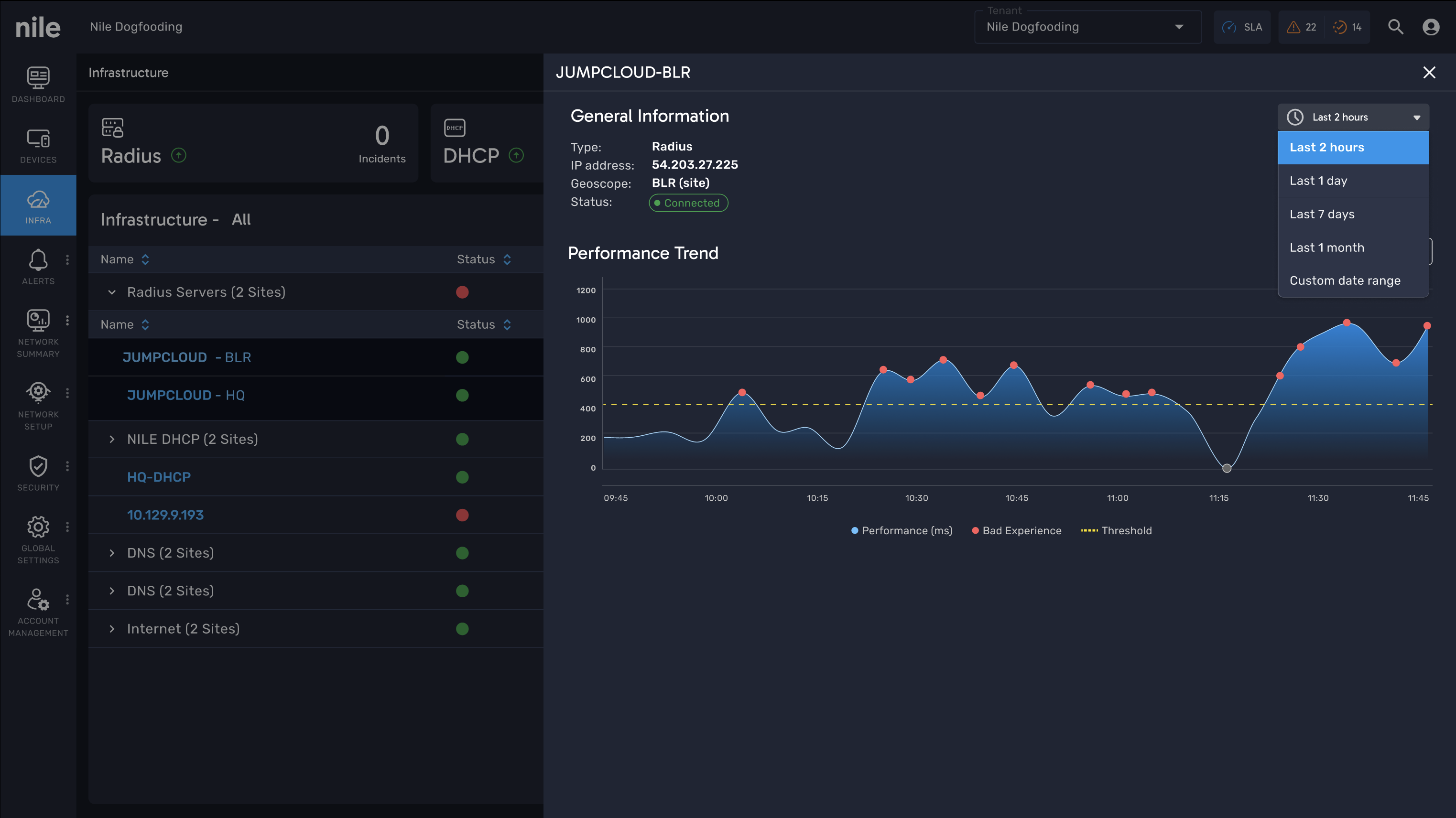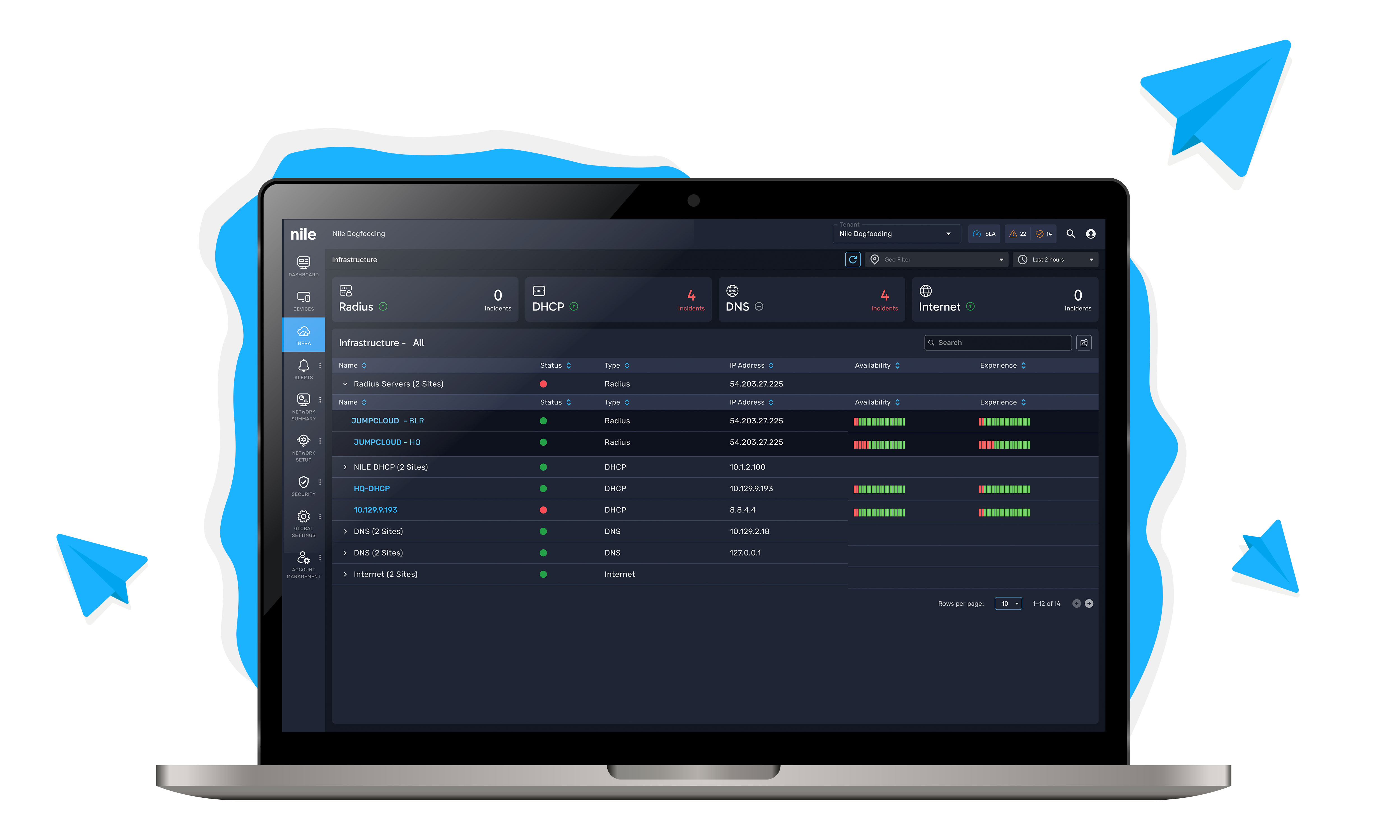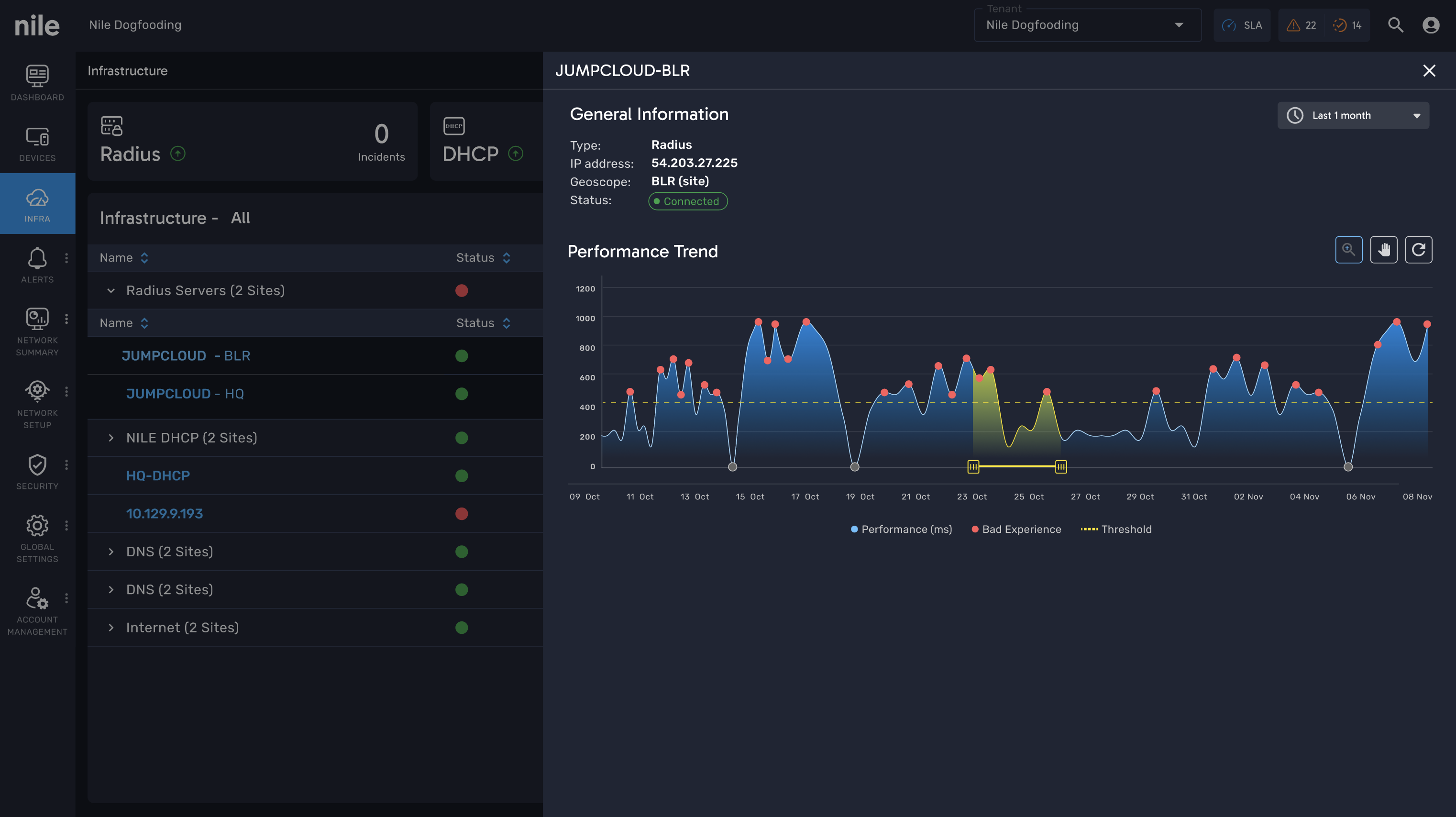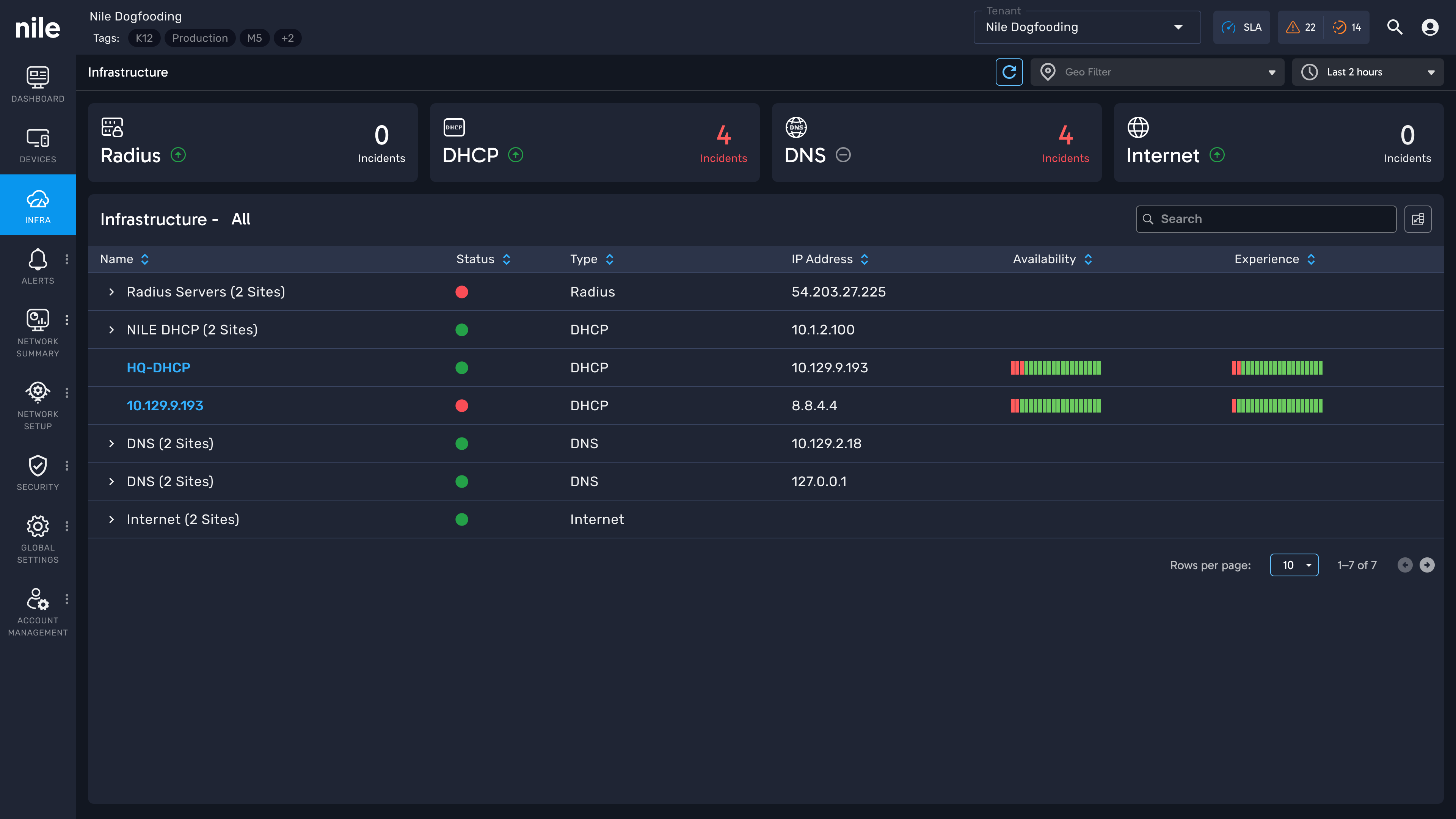 The Infrastructure page is the backbone of Nile Cleo, where admins and CSEs monitor RADIUS, DHCP, DNS, and Internet services across sites. The original design provided basic visibility but suffered from usability issues, inconsistent design patterns, and accessibility gaps. The redesign aimed to deliver a clear, consistent, and scalable monitoring experience, while aligning the product with Nile’s evolving design system.