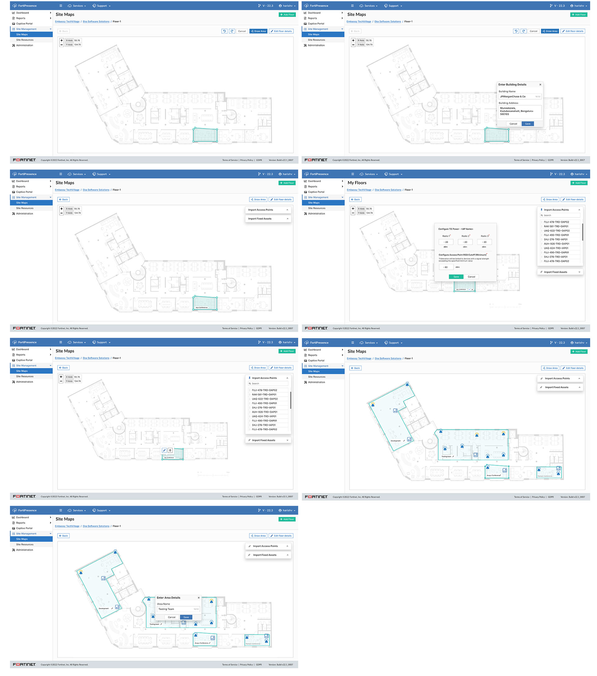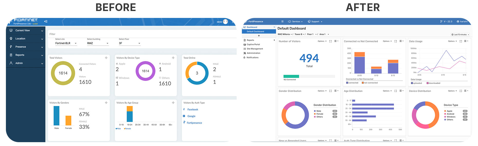 FortiPresence is an enterprise platform that provides visitor analytics and captive portal management. Over time, its dashboards, floor analytics, area analytics, and heatmaps became cluttered, inconsistent, and difficult to interpret, reducing admin efficiency. The redesign aimed to deliver a modern experience that would simplify dashboards, streamline setup flows, and provide deeper, actionable insights for enterprise admins.