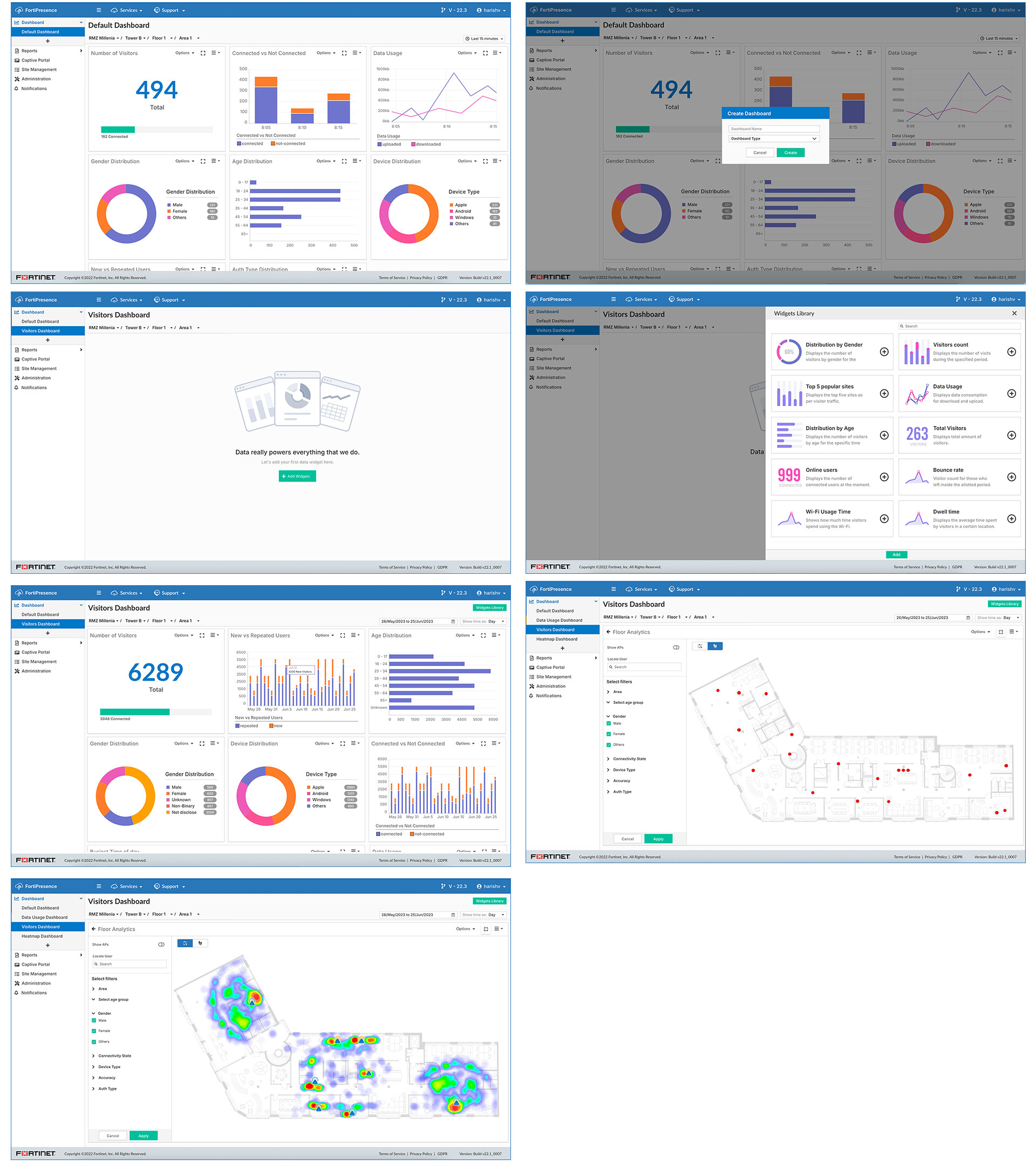 This visual set demonstrates the end-to-end dashboard experience in FortiPresence, showcasing how IT and business users monitor real-time visitor data, customize dashboards, and visualize location heatmaps. The journey blends insight discovery with physical presence mapping.