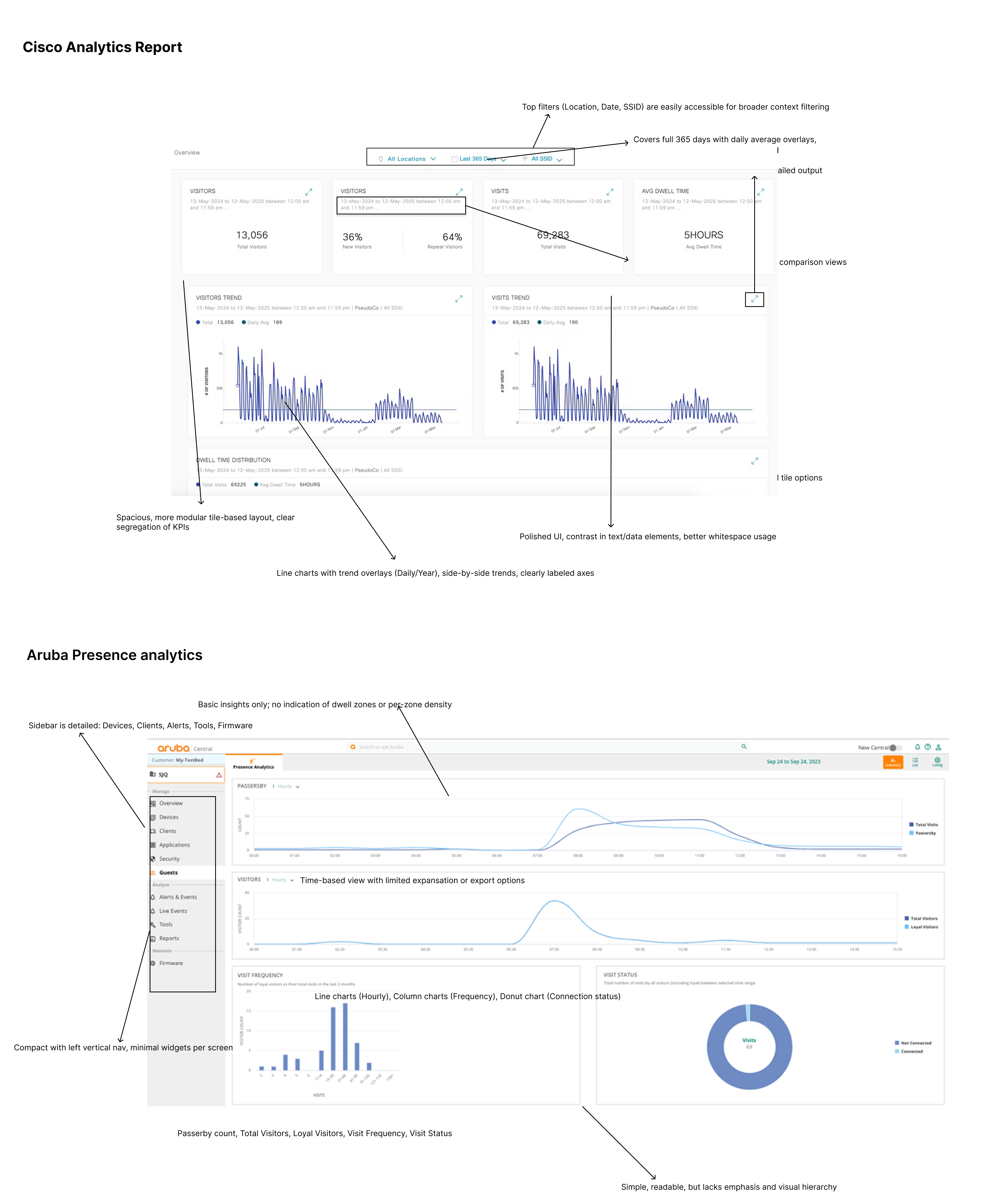 A detailed evaluation of leading location analytics platforms like Cisco Spaces and Aruba Central to understand their strengths, limitations, and design patterns. This helped identify usability gaps and innovation opportunities in visitor tracking, dashboard customization, and captive portal flexibility.
