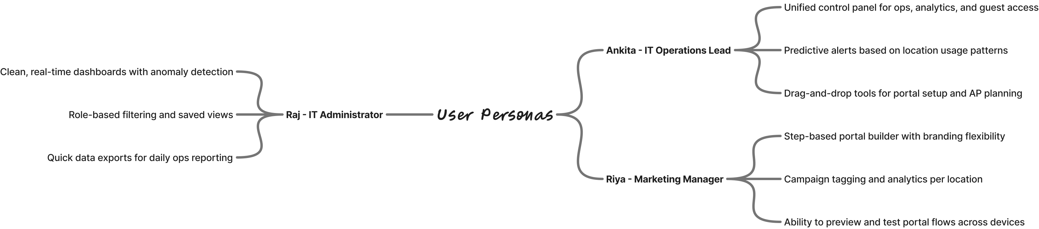We developed proto-personas based on interviews and stakeholder inputs to represent our primary user types—Network Admins, IT Operations Leads, and Marketing Managers. Each had distinct goals, pain points, and needs that directly influenced our design priorities.